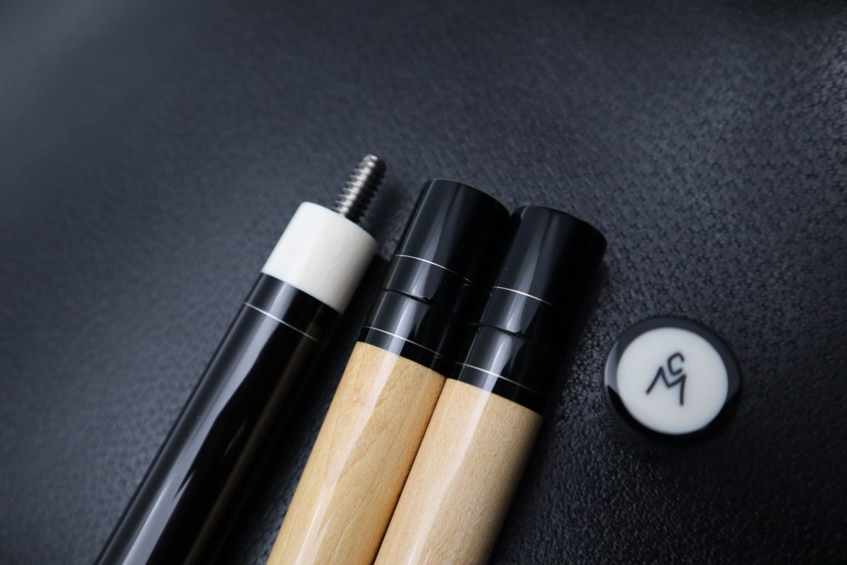 Bill introduced the stylized MC and shark logos and, by request, hand-signed special cues. He has long favored the classic 5/16-14 piloted joint and in 1993 invented a shock-absorbing ring beneath stainless joints—wood never touches steel—aimed at delivering an ivory-like feel. Options also include a 3/8-11 flat-faced joint in steel, phenolic, or ivory. By 1994 he’d adopted CNC—well ahead of the curve—refining both design and repeatable precision through the late ’90s and early 2000s.